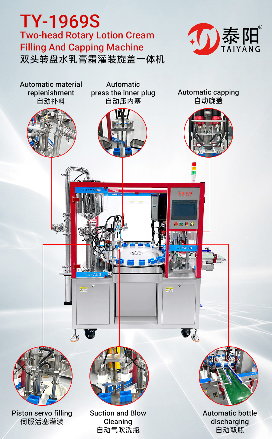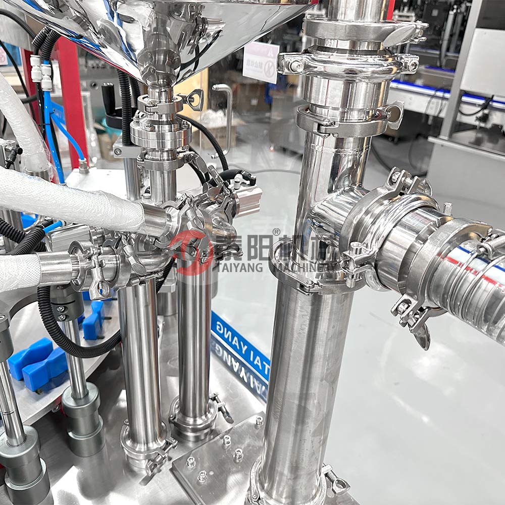 Het frame van Taiyang Lotion Cream Stringstable vul- en aftapmachine is ontworpen met hoogwaardige en prachtige aluminiumprofielen, 304 roestvrij staal voor afdichtingsplaat, 316 roestvrij staal voor het vullen van vloeistof, en alle pneumatische componenten zijn taiwan airtac. GPG -motor en Switchgear voor Schneider.